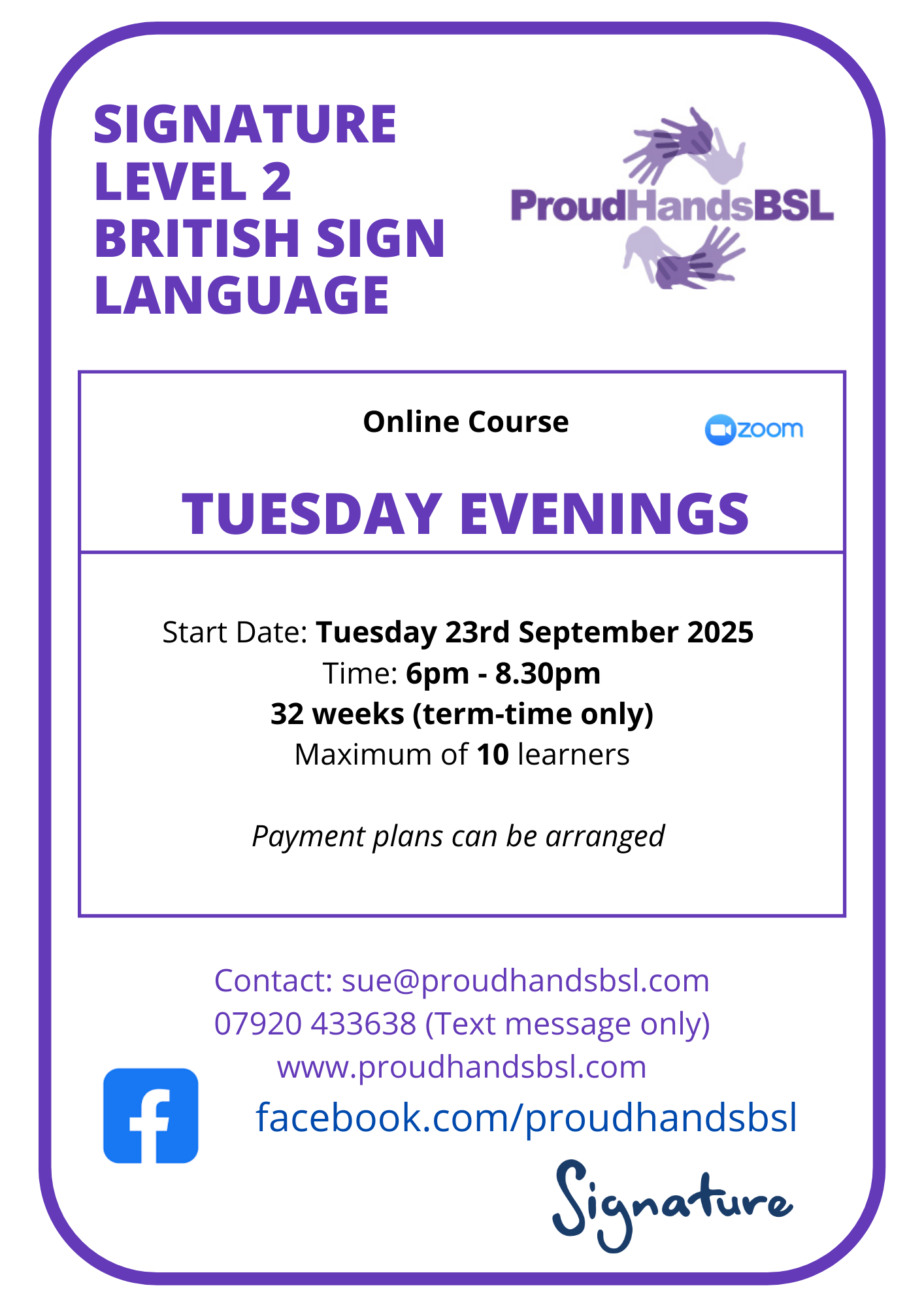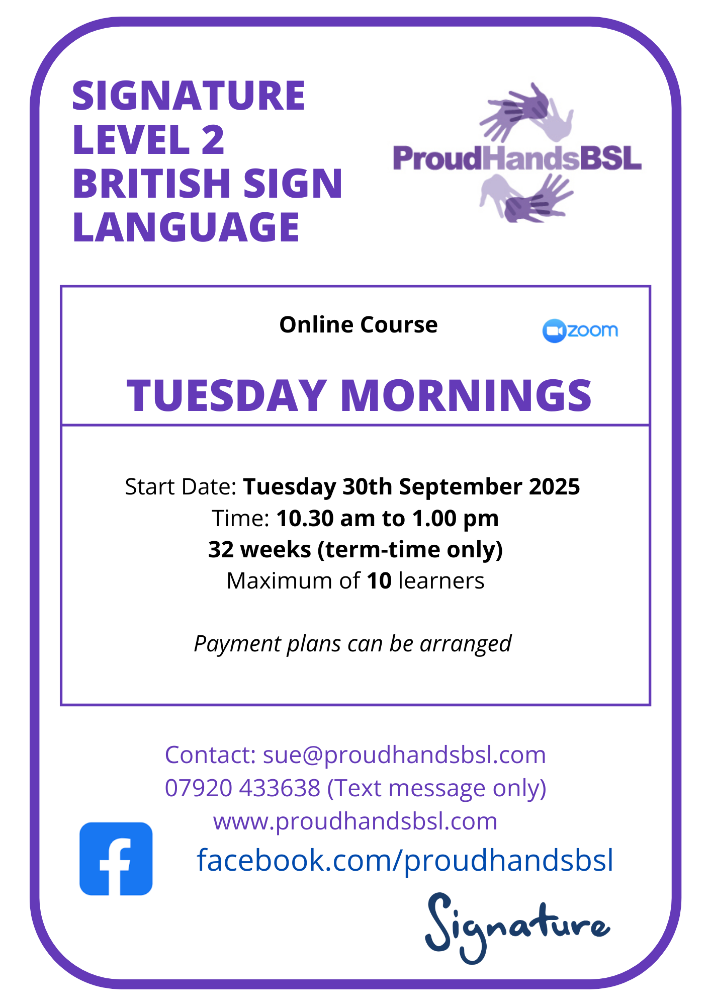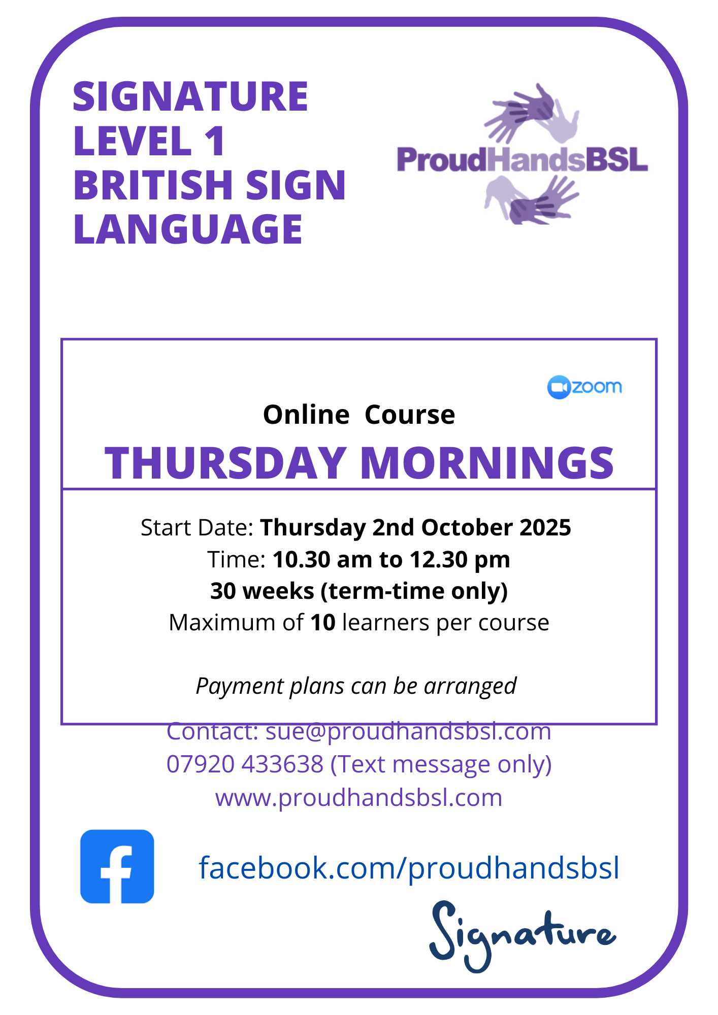 Proud Hands BSL delivers Signature approved British Sign Language (BSL) Level 1 (beginner), Level 2 and Level 3 courses along with Deaf Awareness Training. We also provide refresher courses, one-to-one tuition and assessment practice.